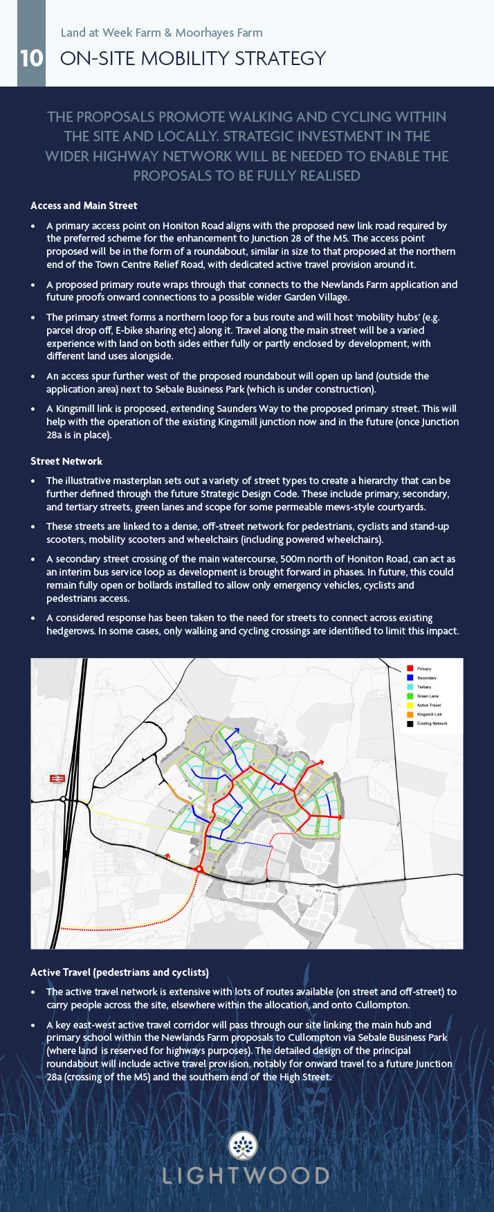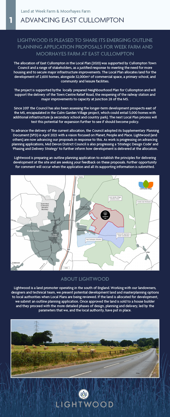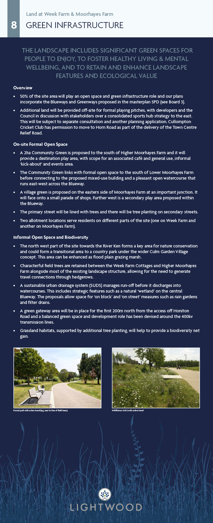 To advance the delivery of the current allocation, the Council adopted its Supplementary Planning Document (SPD) in April 2023 with a vision focused on Planet, People and Place. Lightwood (and others) are now advancing our proposals in response to this. As work is progressing on advancing planning applications, Mid Devon District Council is also progressing a ‘Strategic Design Code’ and ‘Phasing and Delivery Strategy’ to further inform how development is delivered at the allocation. Lightwood is preparing an outline planning application to establish the principles for delivering development at the site and are seeking your feedback on these proposals. Further opportunity for comment will occur when the application and all its supporting information is submitted.